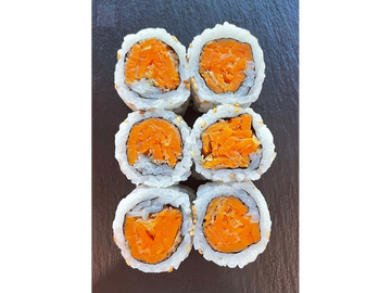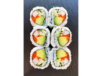 Shrimp tempura, crabmeat, cucumber, avocado, fish roe and topped with avocado