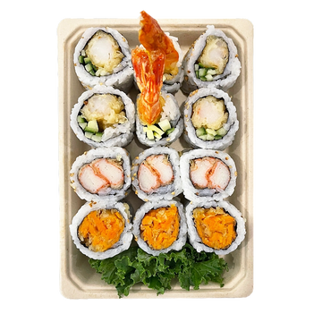 California (3pc), Spicy Salmon (3pc), Shrimp Tempura (3pc), Salmon Sushi (1pc), Tuna Sushi (1pc)