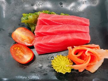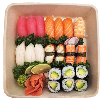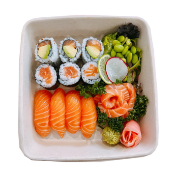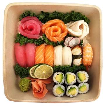 Salmon sushi (2pcs), Tuna sushi (2pcs), Butterfish sushi (2pcs), Unagi sushi (1pc), Shrimp sushi (1pc), Salmon Sashimi (4pcs), Tuna Sashimi (4pcs), Butterfish Sashimi (4pcs) and Avocado roll (6pcs)