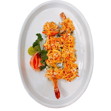 Shrimp tempura, cucumber and avocado topped with Spicy Crabmeat