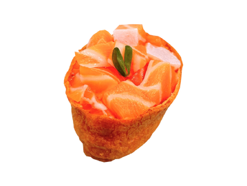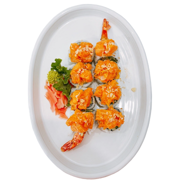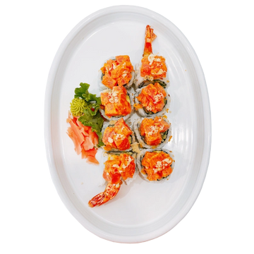 Shrimp tempura, cucumber and avocado topped with Spicy Salmon